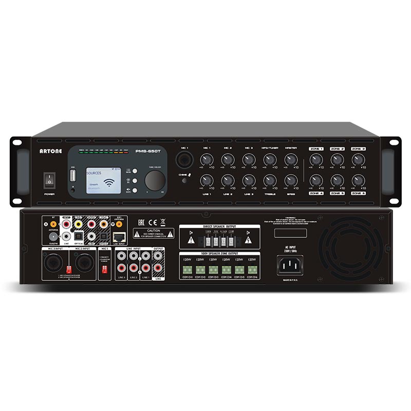 Internet tuner and Bluetooth mixer amplifier PMS-630T and PMS-650T, has 6 zone volume control for separate areas with 100v line output.
